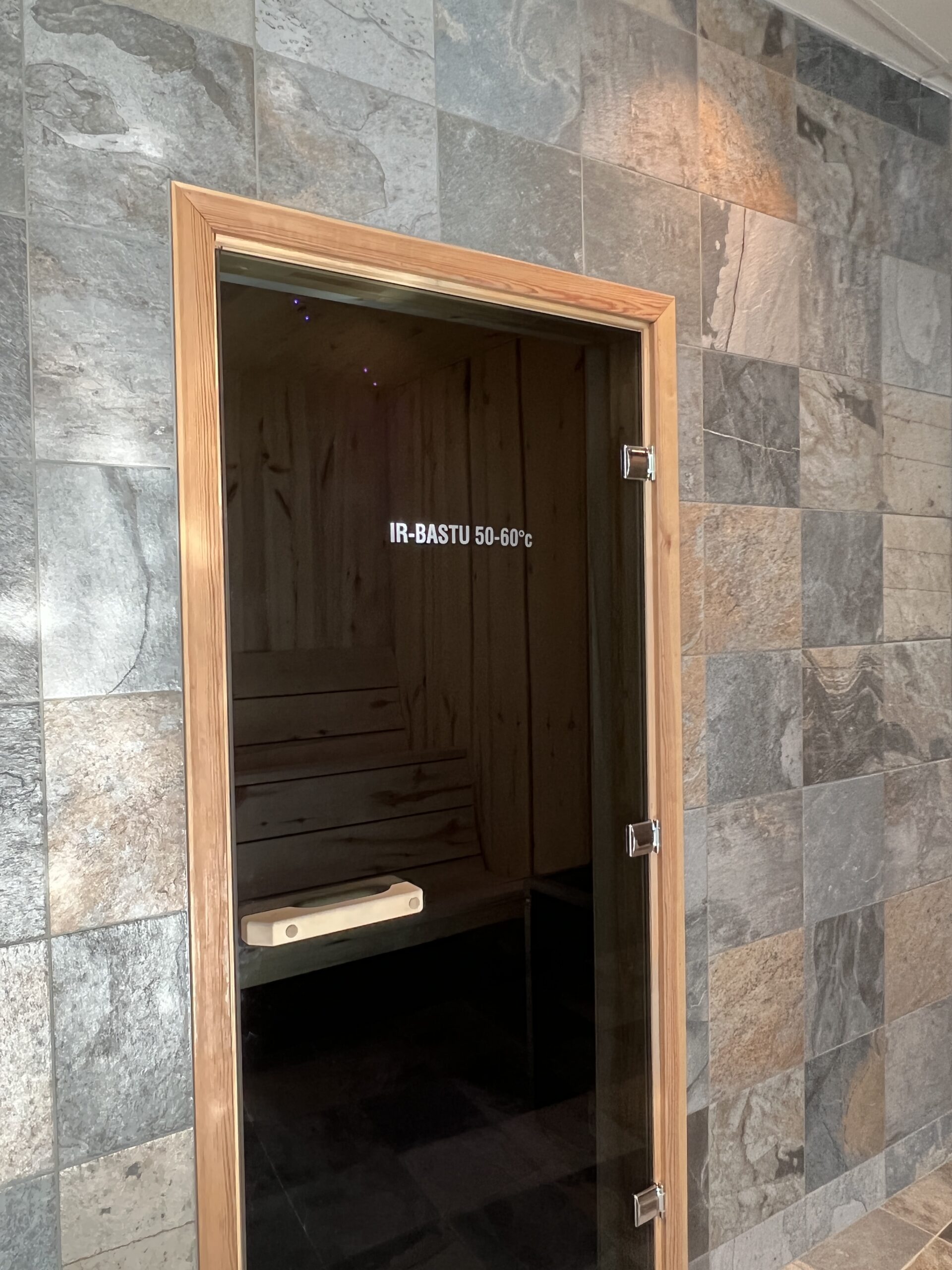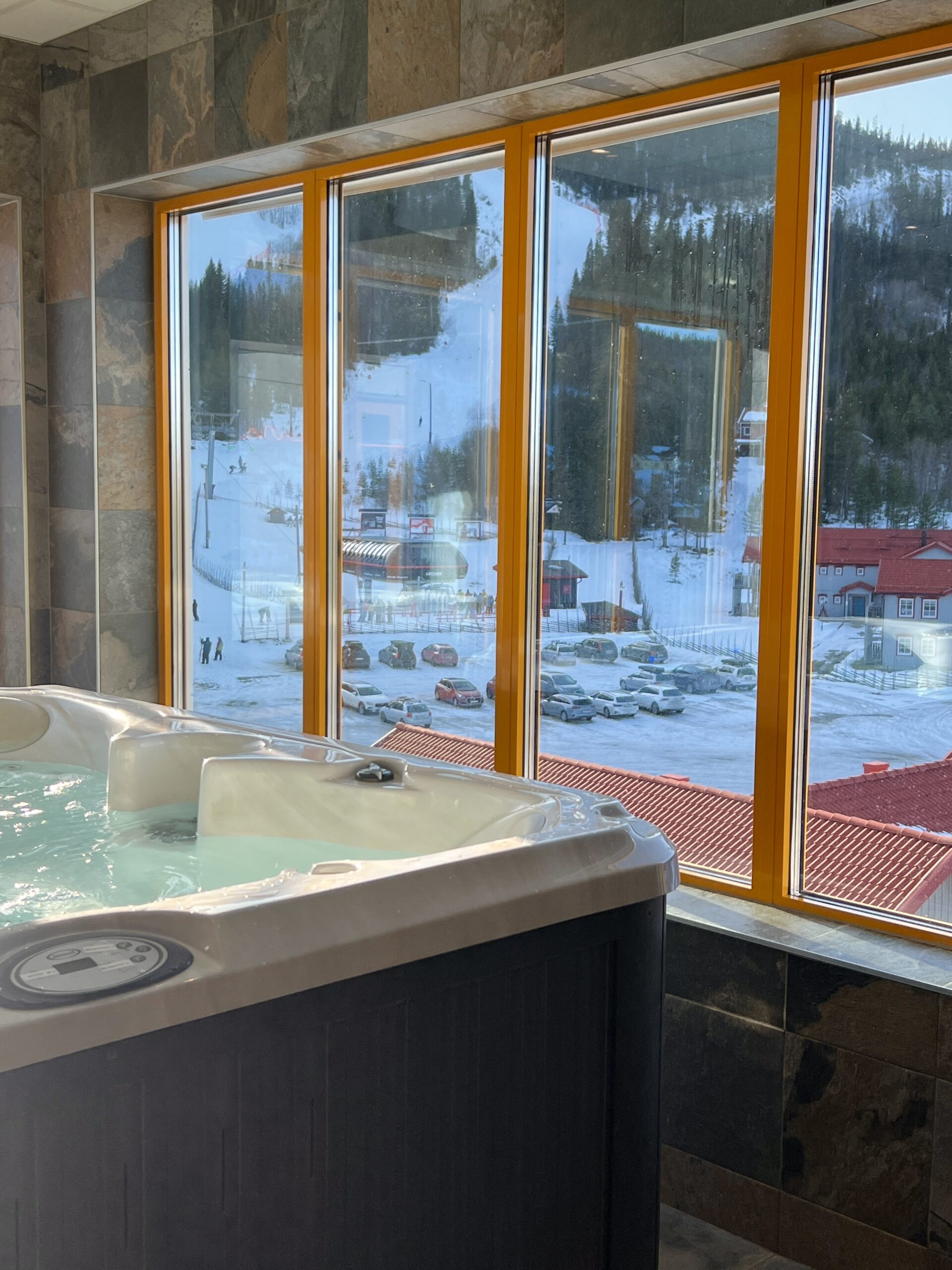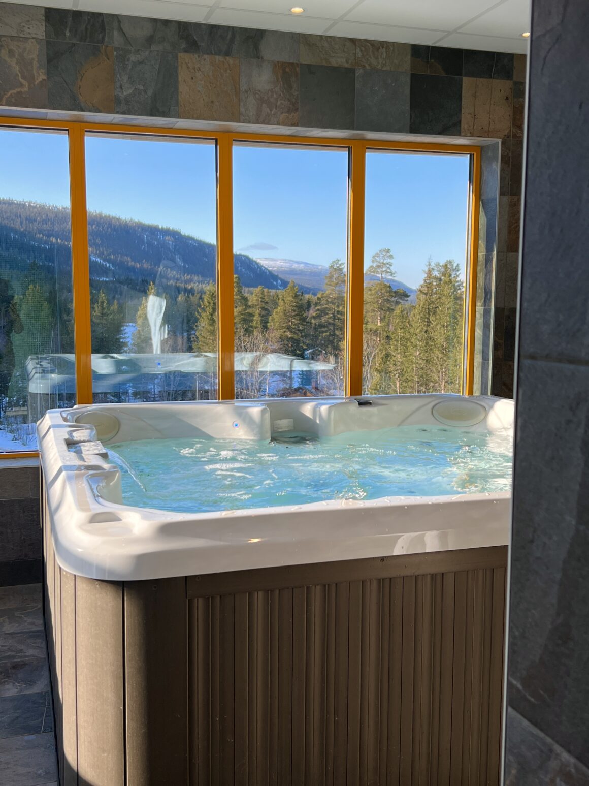 I SPA-avdelningen fanns det mesta man kan behöva för att koppla av ett par timmar. Bubbelbad både utomhus på den stora balkongen och inomhus med utsikt över skog och fjäll. Man kan enkelt själv sköta både bubblor och ljus i poolerna. Det finns ett stort duschrum med flera duschar men även pallar med hinkar om man vill tvaga sig på det sättet eller kanske kasta kallt vatten över sig efter bastun.