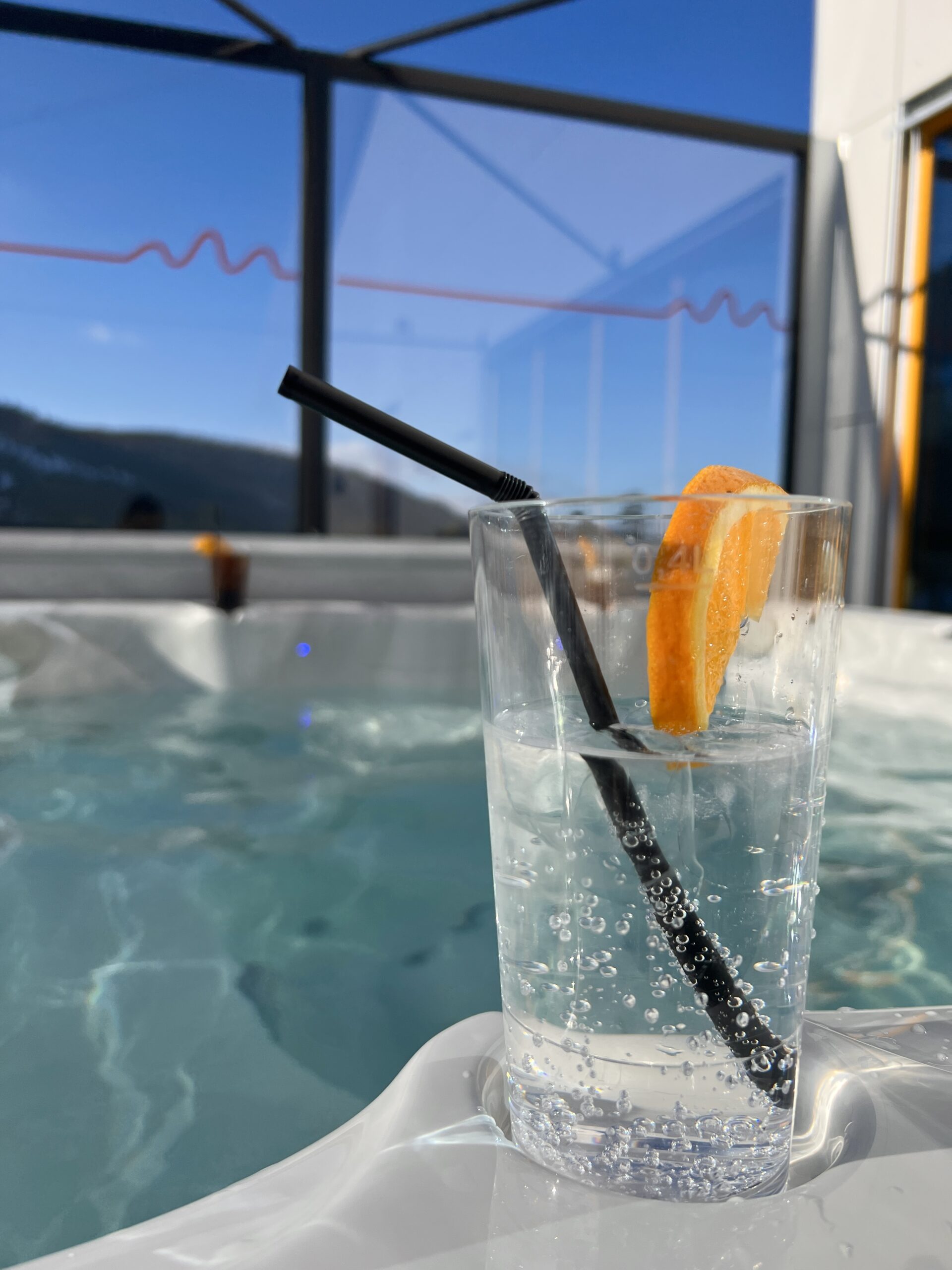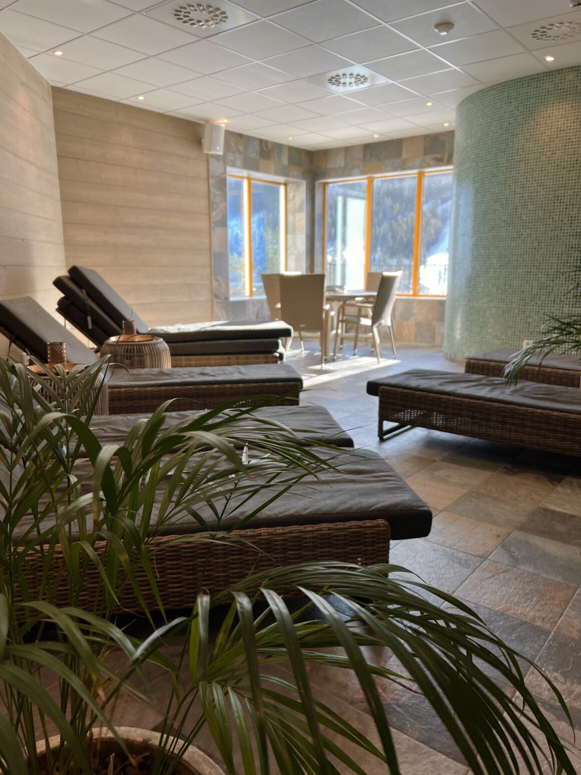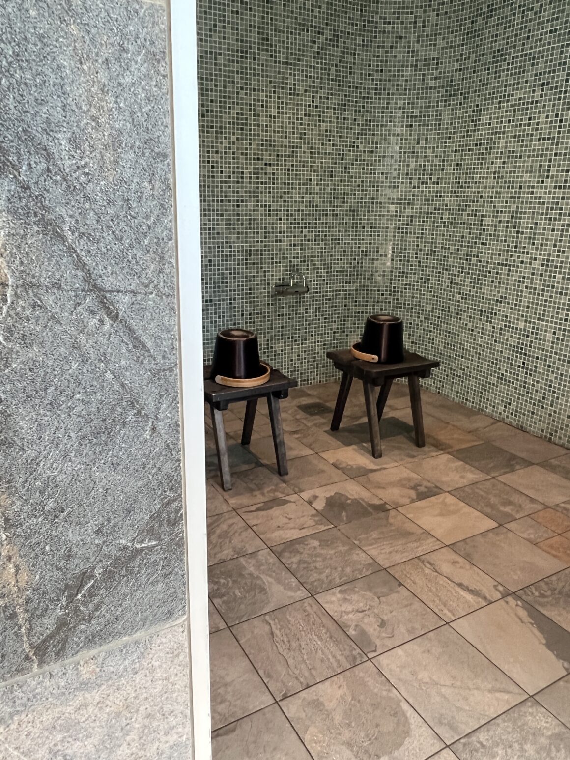 I SPA-avdelningen fanns det mesta man kan behöva för att koppla av ett par timmar. Bubbelbad både utomhus på den stora balkongen och inomhus med utsikt över skog och fjäll. Man kan enkelt själv sköta både bubblor och ljus i poolerna. Det finns ett stort duschrum med flera duschar men även pallar med hinkar om man vill tvaga sig på det sättet eller kanske kasta kallt vatten över sig efter bastun.