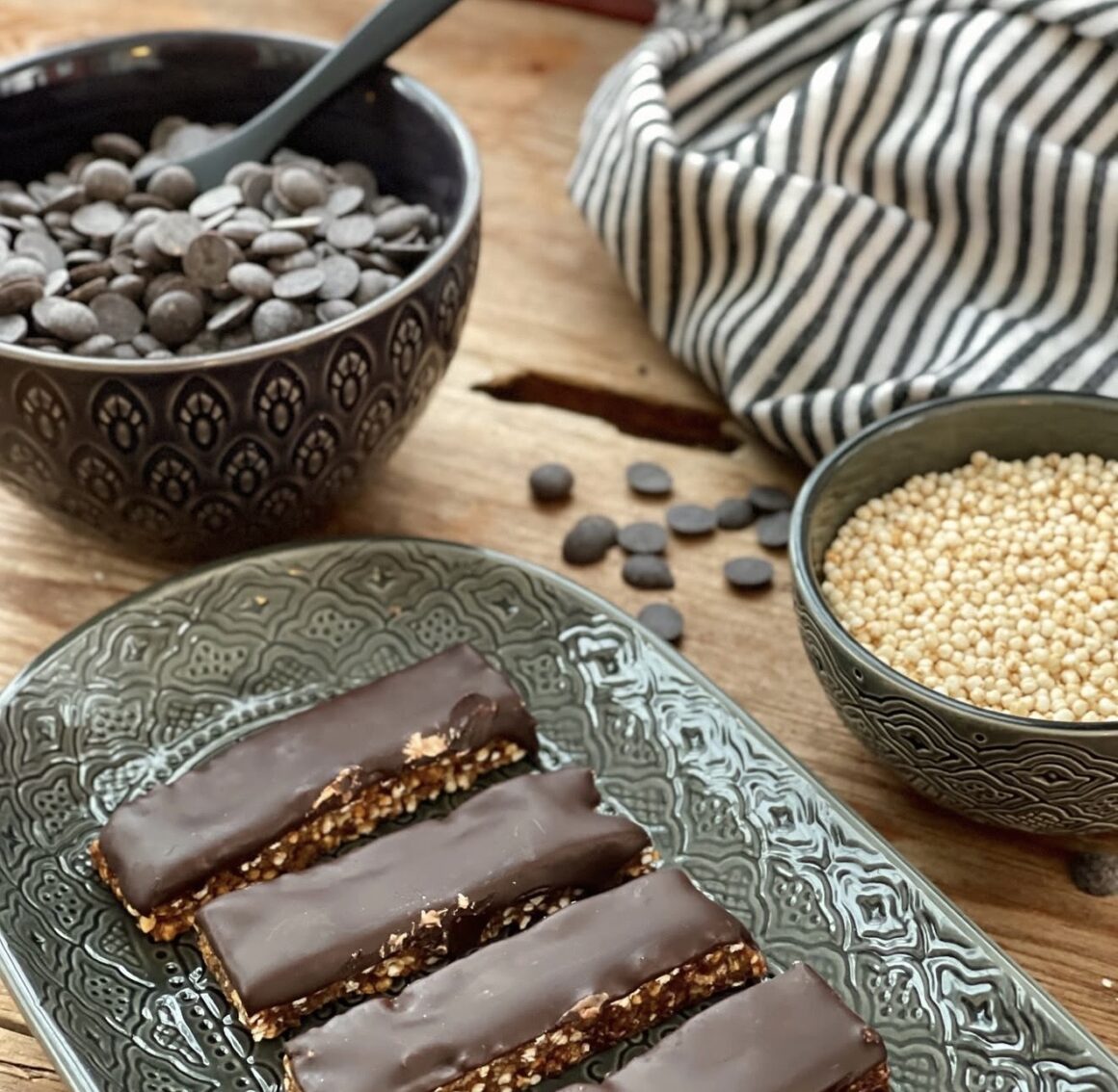 • Smält 3 dl jordnötssmör, 2 dl dadelsirap och 1 dl kokossocker på svag värme. • Rosta 3 dl kokosflingor i en stekpanna. • Rör ner kokos + 4 dl dl quinoapuffar i jordnötssmeten. • Tryck ut smeten i lämplig tjocklek i en form eller bara på ett bakplåtspapper. Enklast är att lägga ett annat papper uppepå och trycka ut med handen eller en kavel. • Låt stelna i kallt utrymme. • Smält 250 gram sockerfri choklad i ett vattenbad. • Skär bars av den stelnade smeten och doppa dem till hälften i chokladen. • Ställ för att kallna igen!